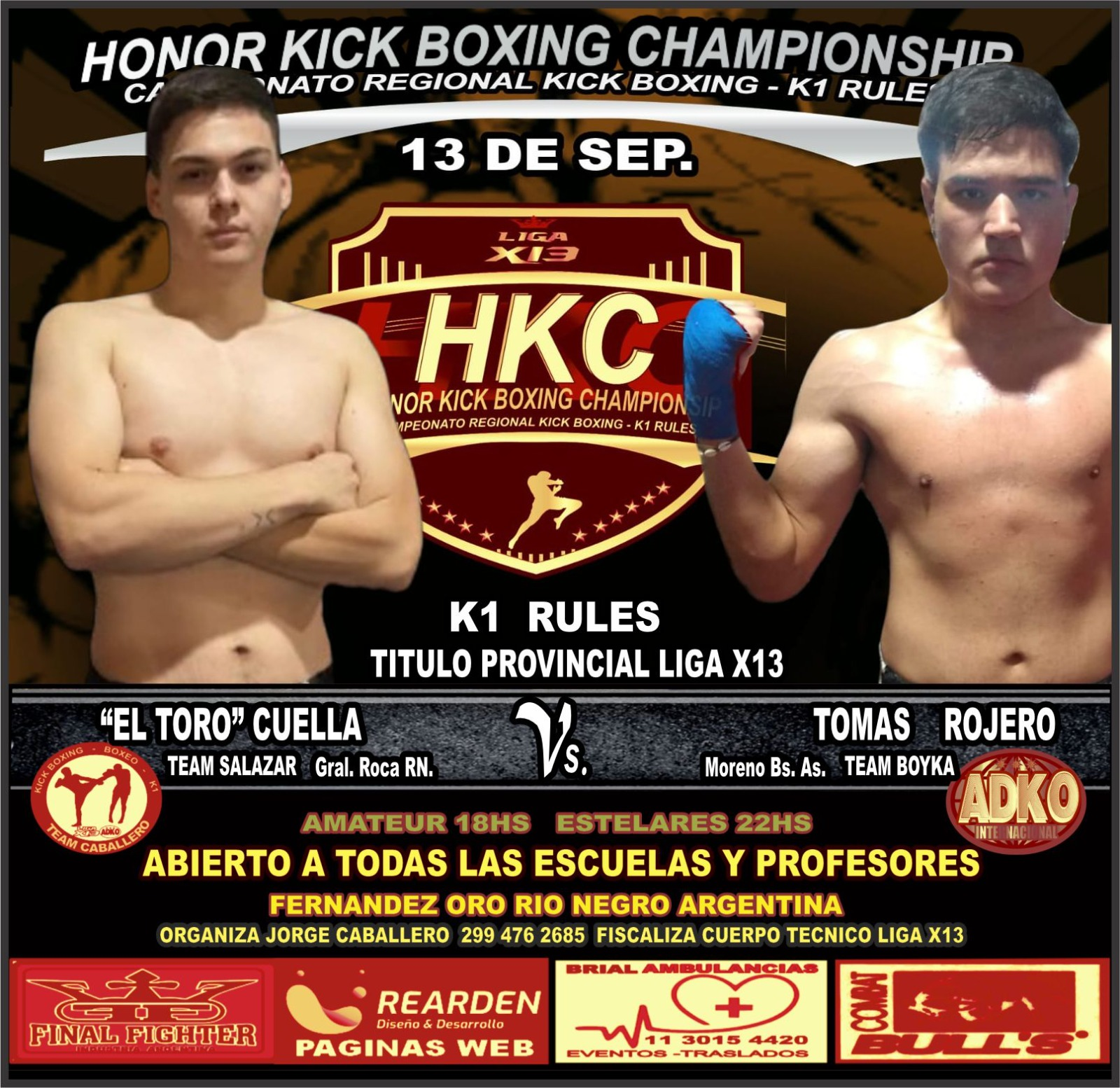 Explota CIPOLLETTI!!! Se viene la primer gran edicion de HONOR KICK BOXING CHAMPIONSHIP. Organiza: JORGE CABALLERO, TEAM SALAZAR. FISCALIZA LIGA X13 !!! el próximo 13 de Septiembre en General Fernández Oro, Rio Negro. No te lo podes perder !!